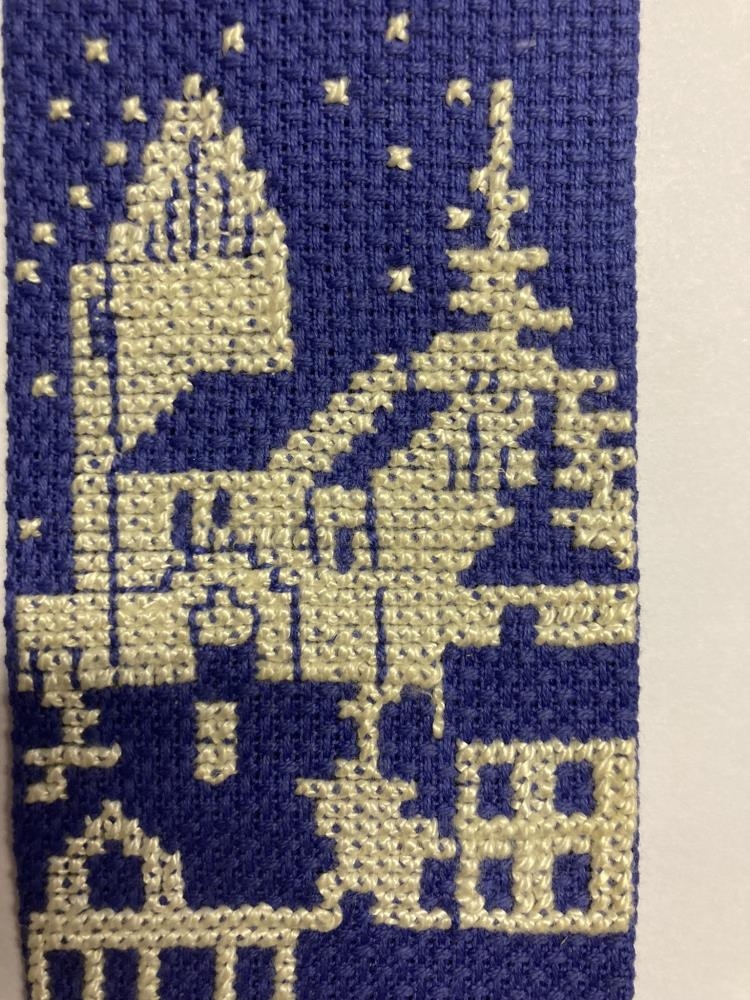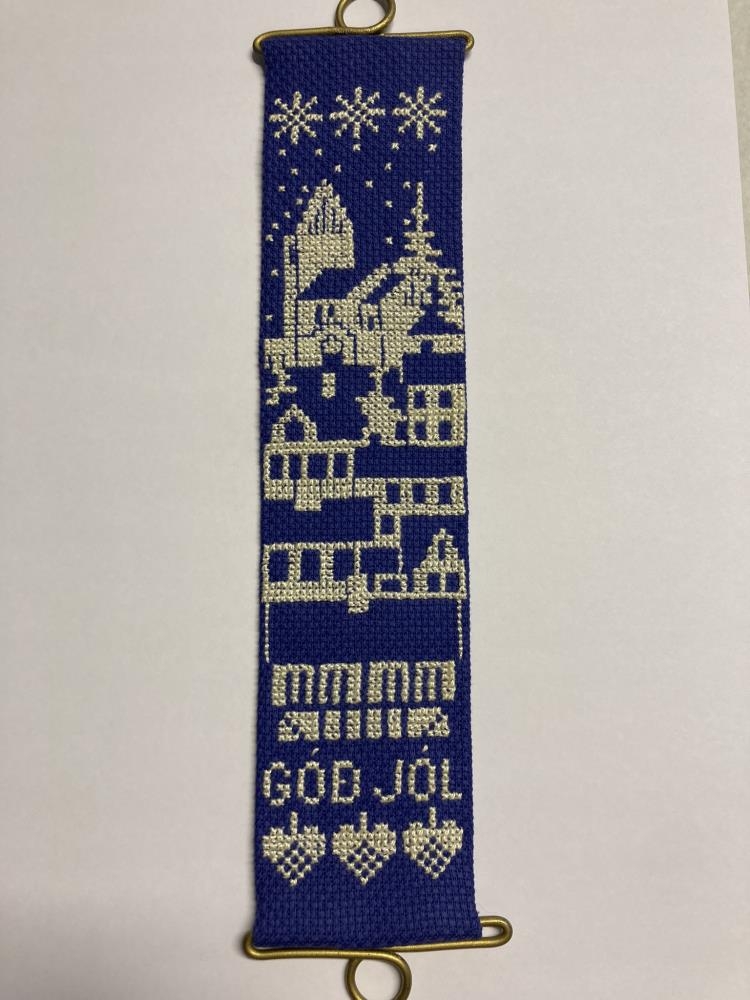 Lítill klukkustrengur, verk Sigríðar Stefaníu Gísladóttur frá Hamragörðum. Hvítur útsaumur í bláan jafa.