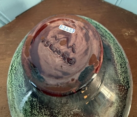 Skrautskál, íslensk, "Ísland", þverm. 17,5 cm. Skiptir fallega litum. Gefendur Páll Ævar Pálsson tannlæknir í Kópavogi, Stefán Pálsson og ( Bergþóra) Karen Pálsdóttir nú búsett á Spáni. Úr búi Páls Sigurðssonar bónda í Skammadal í Mýrdal og Bergþóru Sveinsdóttur konu hans. Kom frá dánarbúi móðurbróður þeirra systkina, Sveins Pálssonar í Blönduhlíð 7, Reykjavík, sem dó 2003. Einnig úr búi Ársæls Sigurðssonar skólastjóra og Sigurbjargar Pálsdóttur, Blönduhlíð 7.