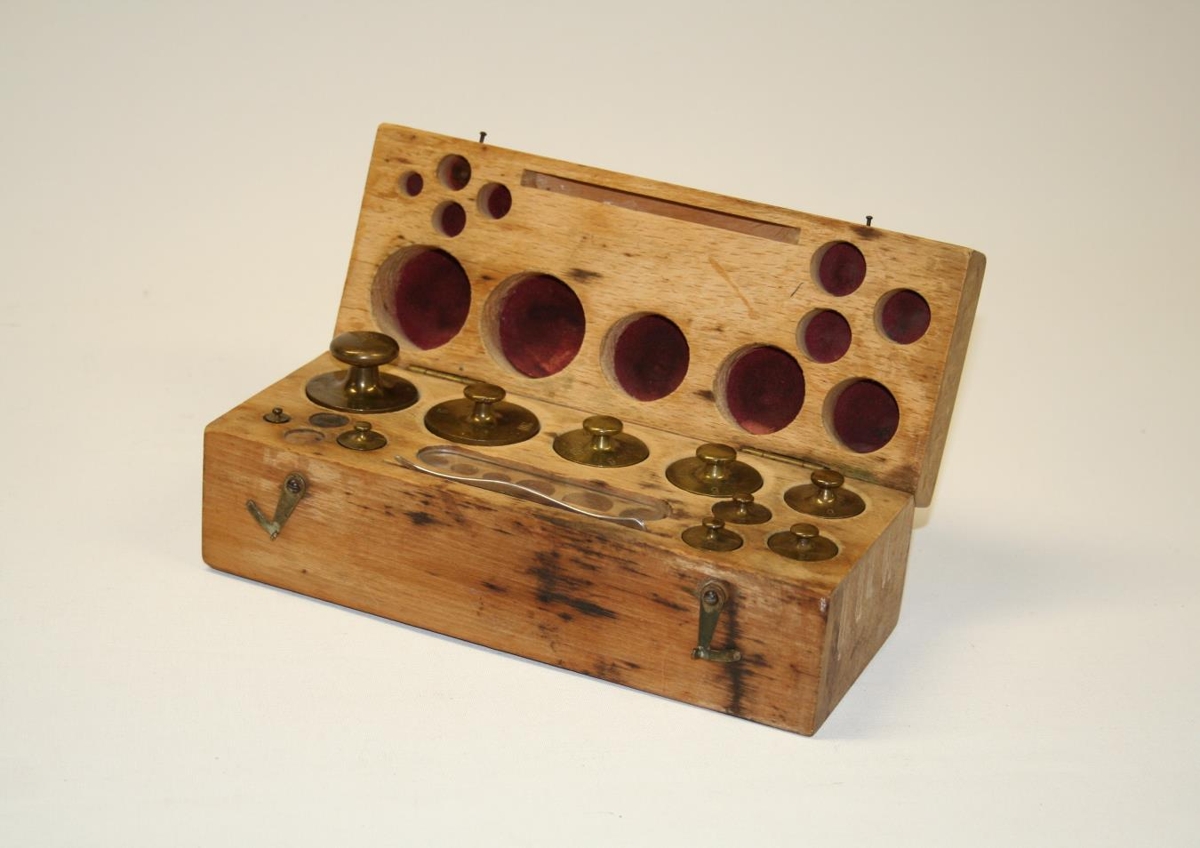 Í stokknum (kassanum) eru 10 eir (kopar) lóð: 500 g, 200 g, 100 g x stk, 50 g, 20 g, 10 g x 2 stk, 5 g og 1 g. Einnig eru 500 mg x 2 stk og 200 mg úr platinu.