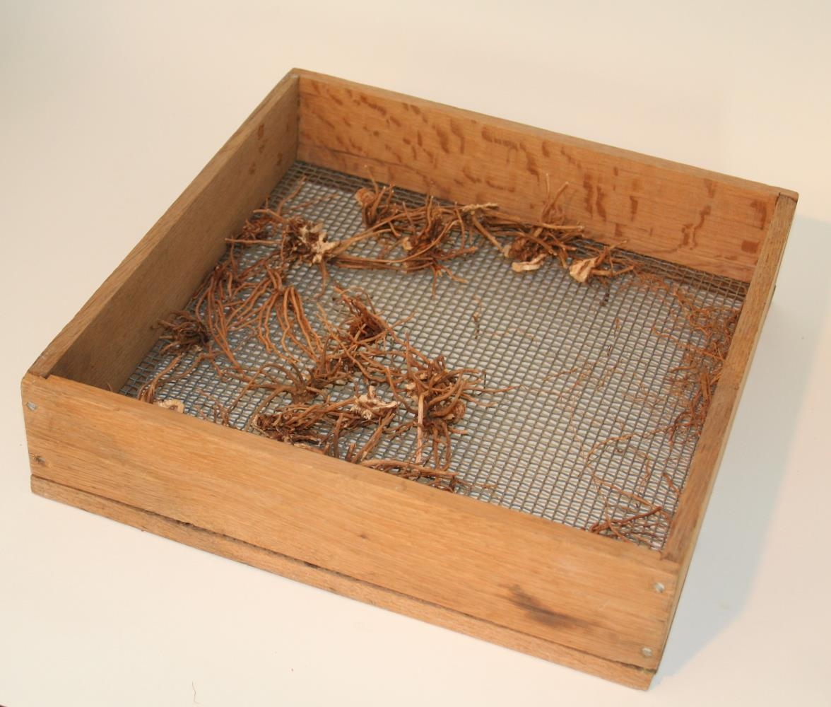 Gróft málmsigti í tréramma. Á sigtinu er Rhizoma valeriane sem er rót af plöntunni garðabrúði.