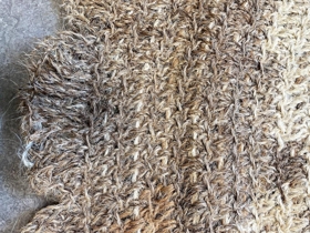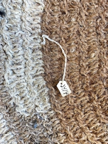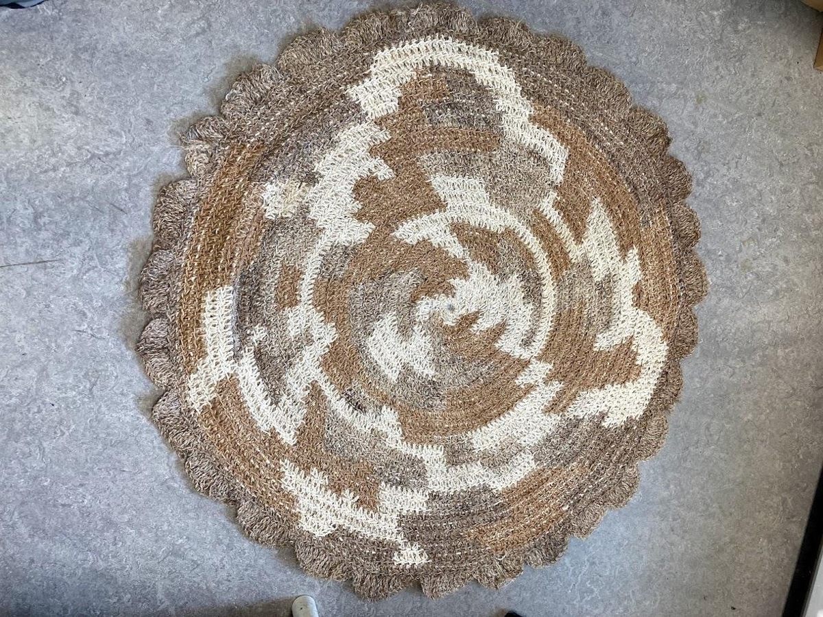Gólfmotta úr hrosshári, þrílit, þverm: 112 sm. Hún er hekluð af móður gefanda, Ragnhildi á Stóra-Hofi, en faðir hennar Jón Einarsson frá Hvoli í Mýrdal vann hrosshárið.