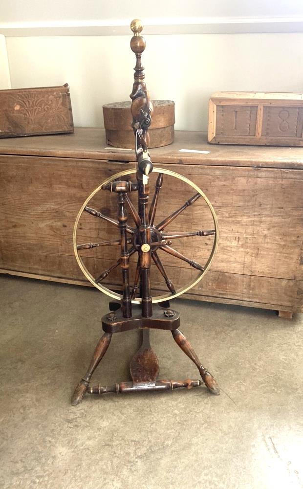 Spunarokkur, látúnsgjörð á hjóli. Smíðaður af Jóni Erlendssyni á Arngeirsstöðum í Fljótshlíð. Listasmíði. Foreldrar Margrétar fengu Jón til að smíða rokkinn handa henni.