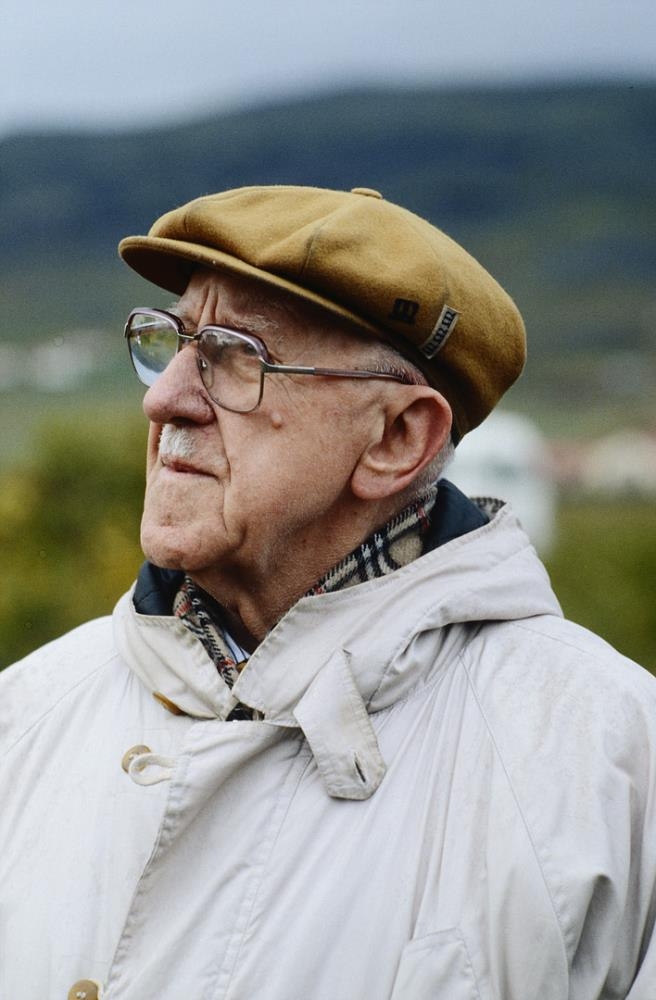 Halldór á efri árum, tekur á móti Magnúsi Magnúsmannai sjónvarpsmanni, útgefandinn hans Ólafur Ragnarsson var viðstaddur.