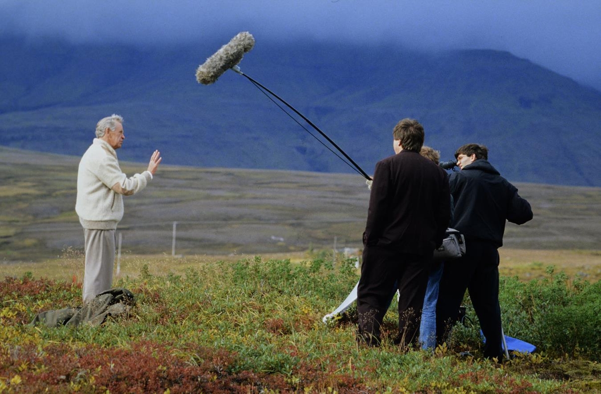 Halldór á efri árum, tekur á móti Magnúsi Magnússyni sjónvarpsmanni, útgefandinn hans Ólafur Ragnarsson var viðstaddur.