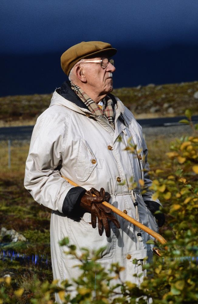 Halldór á efri árum, tekur á móti Magnúsi Magnúsmannai sjónvarpsmanni, útgefandinn hans Ólafur Ragnarsson var viðstaddur.