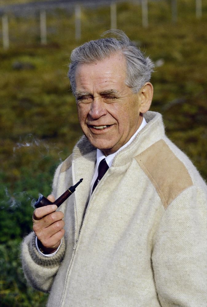 Halldór á efri árum, tekur á móti Magnúsi Magnússyni sjónvarpsmanni, útgefandinn hans Ólafur Ragnarsson var viðstaddur.