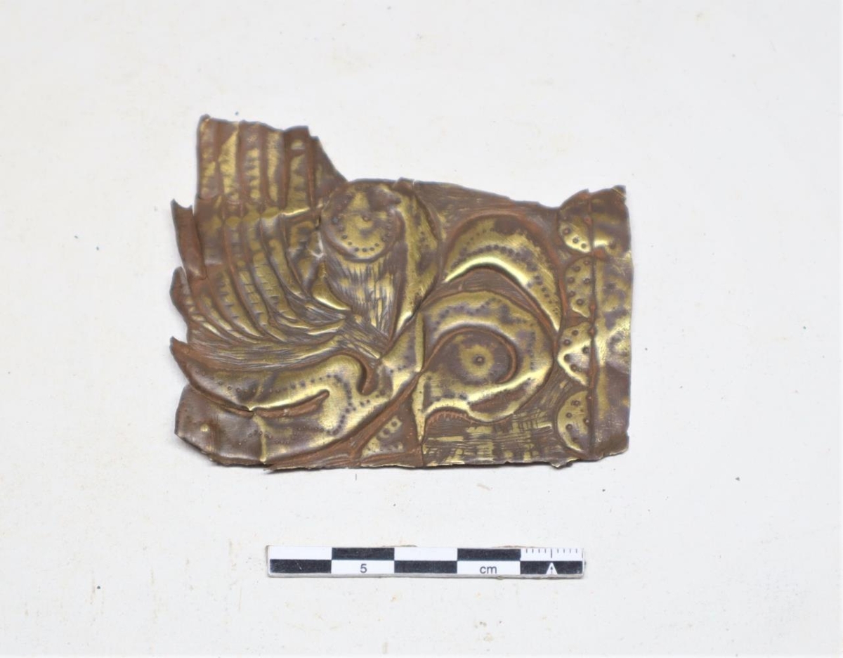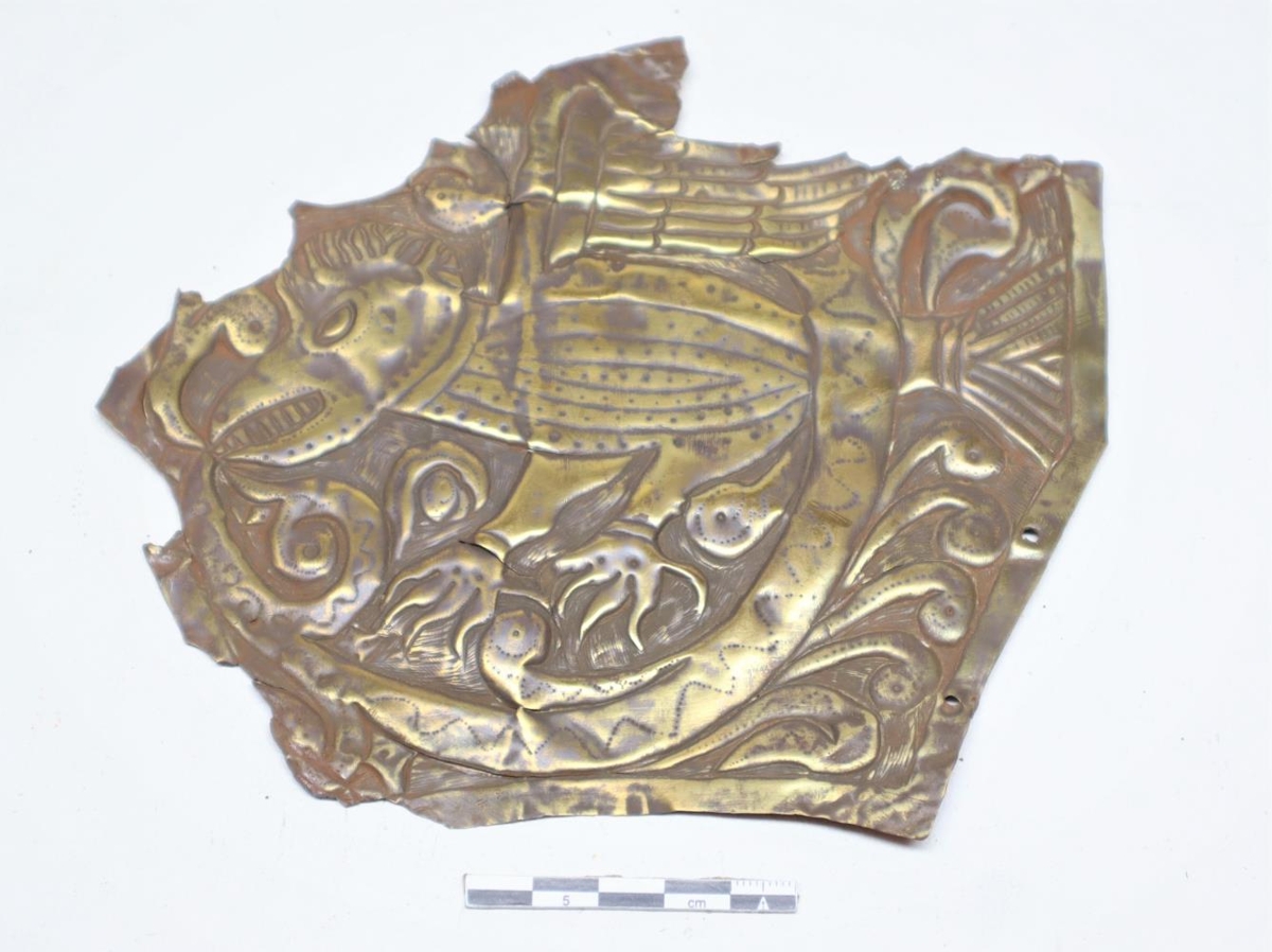 Látúnshyrna með vængjuðu kynjadýri með sporð og jurtaskrauti umhverfis. Virðist frá 17. öld. Fannst í gamla bænum á Gilá en hann var rifinn.