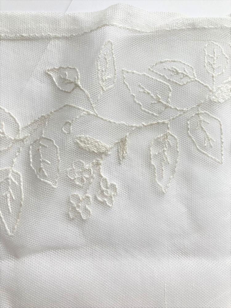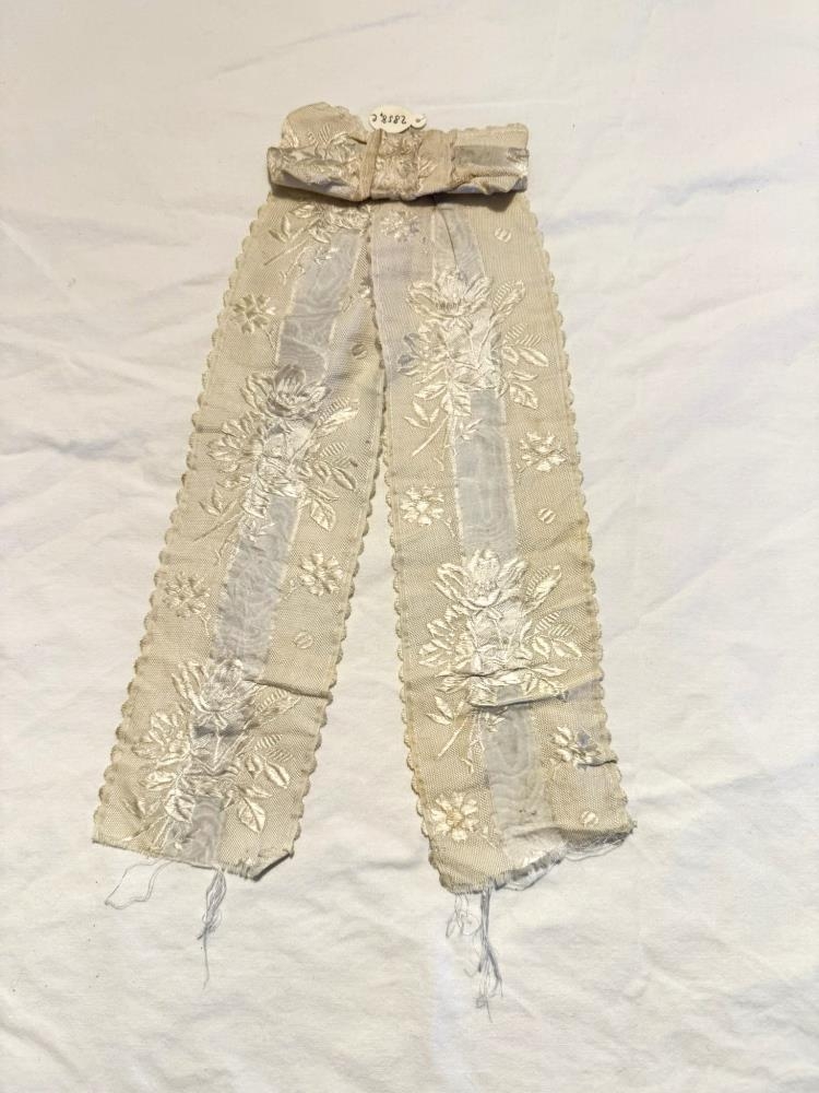 Frá skautbúningi Vilborgar Tómasdóttur á Hrútafelli: a) Koffurband eða koffurborði, blár að lit með 12 samskonar viravirkislaufum úr silfri og stærra miðlaufi. Ekki yngra en frá um 1870. b) Blæja eða slör. c) Silkislaufa eða borðar frá faldi, borin í hnakka.
