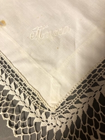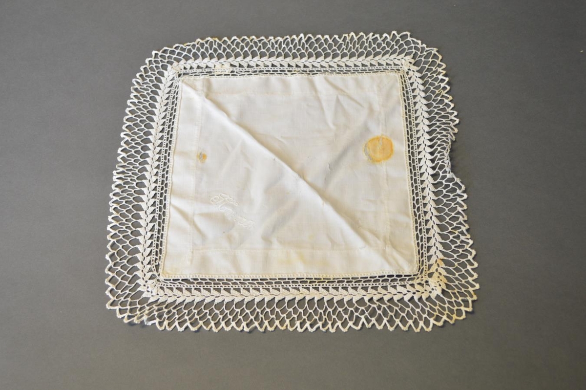 Vasaklútur með heklaðri blúndu, merktur Anna. Verk móður gefanda, Önnu Skæringsdóttur í Skarðshlíð. Viðgerður af Margréti Gísladóttur í Þjóðminjasafni (blúnda var laus frá).