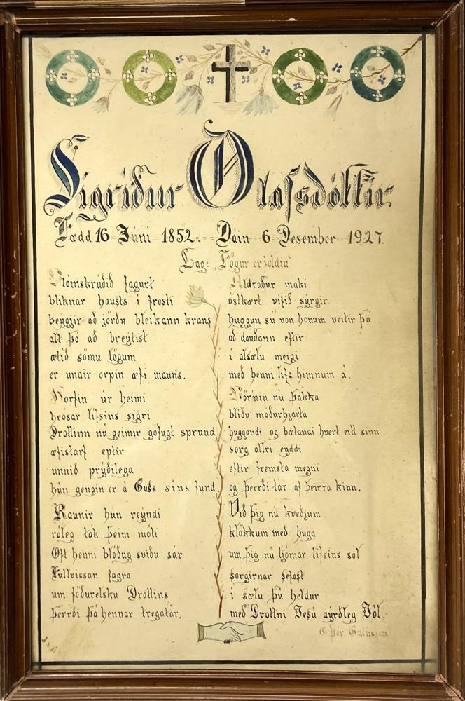 Minningarljóð um Sigríði Ólafsdóttur móður Hafliða Guðmundssonar í Búð, skrautletrað og innrammað. Undirritað G. Þór Guðnason. Sigríður var fædd 16. júní 1852, dáin 6. des. 1927. Afhent af Kristjóni Hafliðasyni í Búð í Þykkvabæ og fjölskyldu Hafliða Guðmundssonar í Búð.