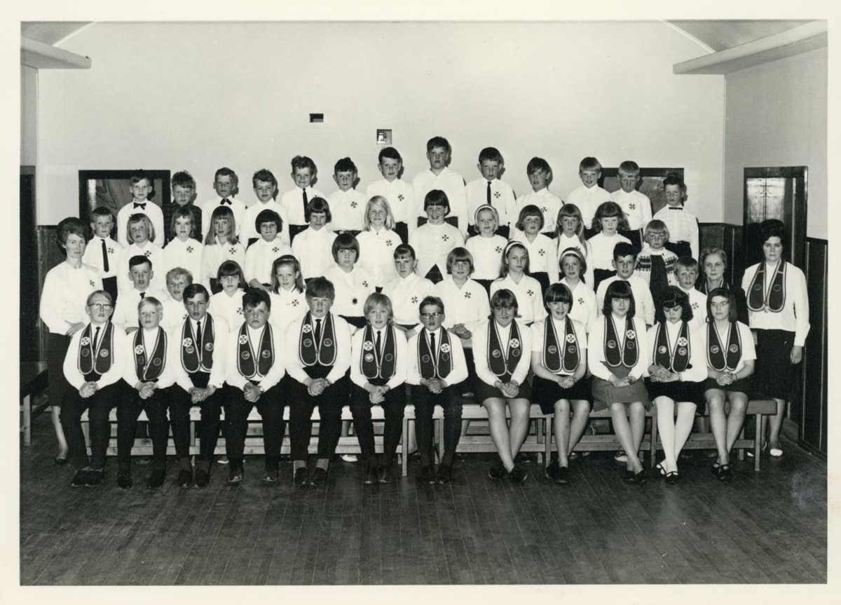 Börn í Barnastúkunni Siðsemd nr. 14 í Garði ásamt gæslumönnum sínum, Steinunn Sigurðardóttir frá Brekku í Garði til vinstri og Sigrún Oddsdóttir frá Nýjalandi í Garði til hægri. Myndin er tekin í Samkomuhúsinu í Garði í tilefni 75 ára afmælis barnastúkunnar árið 1966, stúkan var stofnuð 4. des. árið 1891.