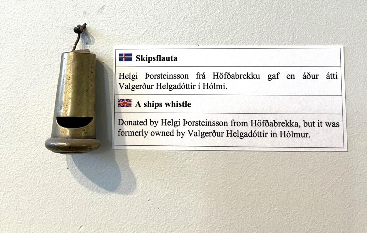 Lítil málmflauta úr kopar (skipstjóraflauta). Frá strandi. Gef. Helgi Þorsteinsson frá Höfðabrekku. Valgerður Helgadóttir í Hólmi gaf Helga.