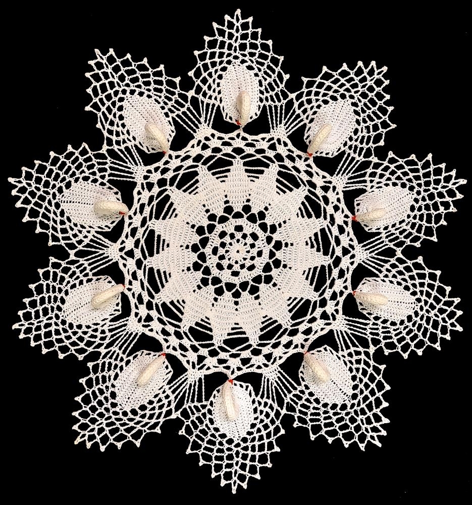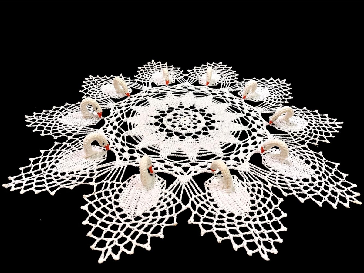 Heklaður hvítur dúkur sem er hringlaga með tíu svönum.