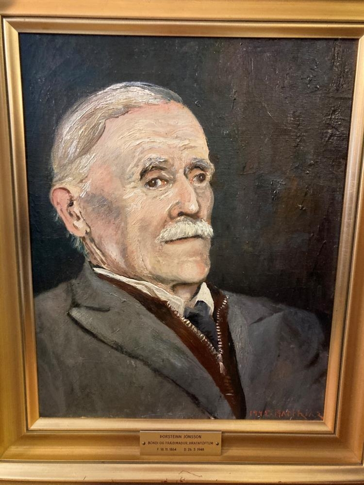 Innrammað olíumálverk Matthíasar Sigfússonar af Þorsteini Jónssyni bónda á Hrafntóftum, afa gefanda. Gefið af Grétari Björnssyni frá Hvolsvelli. Stærð 46 x 55 cm. Þorsteinn var faðir Margrétar konu Björns Fr. Björnssonar sýslumanns, en þau voru foreldrar Grétars. Þorsteinn var fæddur 1864, dáinn 1948, sbr áletraða plötu á ramma.