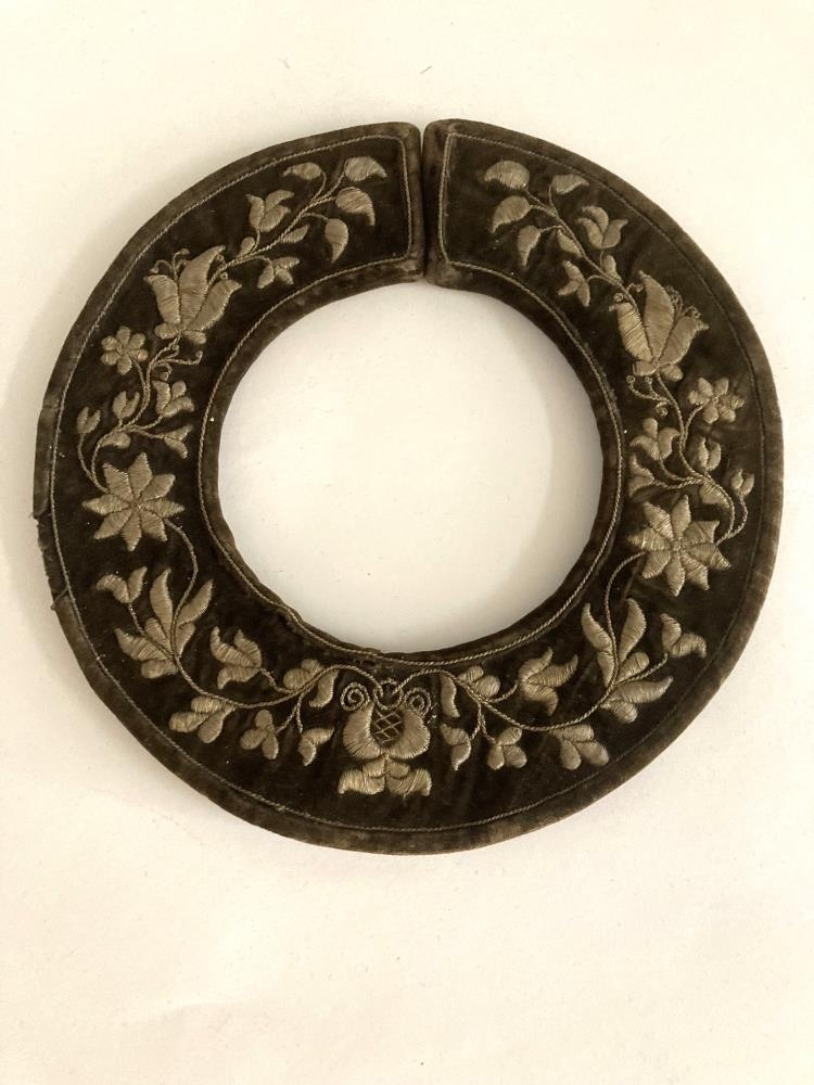 Belti og kragi frá skautbúningi, balderað af Sigríði Nikulásdóttur í Tungu í Fljótshlíð. Hún var dóttir Nikulásar Árnasonar hreppsstjóra á Selalæk, kona Þórðar Ingvarssonar í Tungu. Hún dó 1864, 25 ára.Gefið af systkinum Fanneyjar Nikulásdóttur úr dánarbúi hennar. Afhent af Bryndísi Nikulásd. og manni hennar Lárusi Gíslasyni.