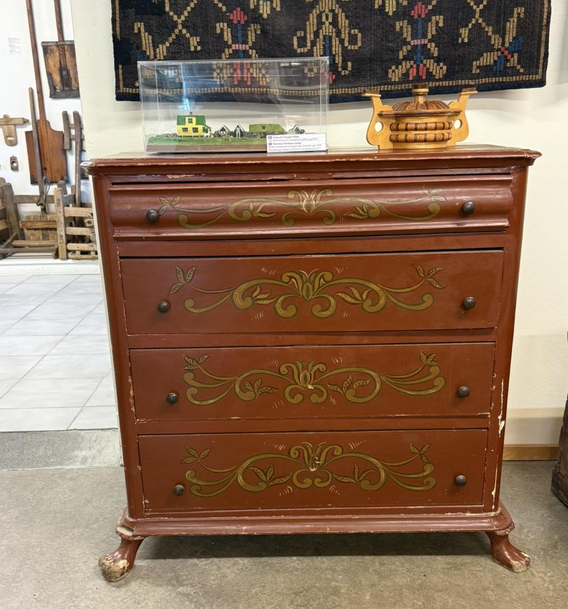 Kommóða, smíðuð af Páli Ólafssyni á Litlu-Heiði og úr eigu hans. Skúffur skrautmálaðar á framhlið.