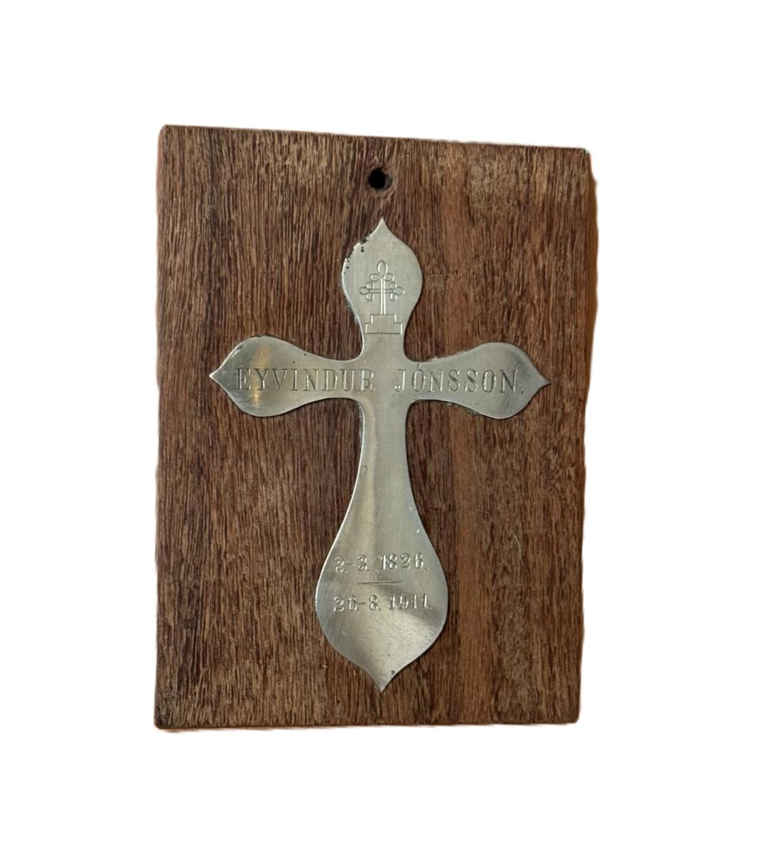 Kross úr nýsilfri. Á hann er letrað: Eyvindur Jónsson, 2.-3. 1826, 26.-8.1911.