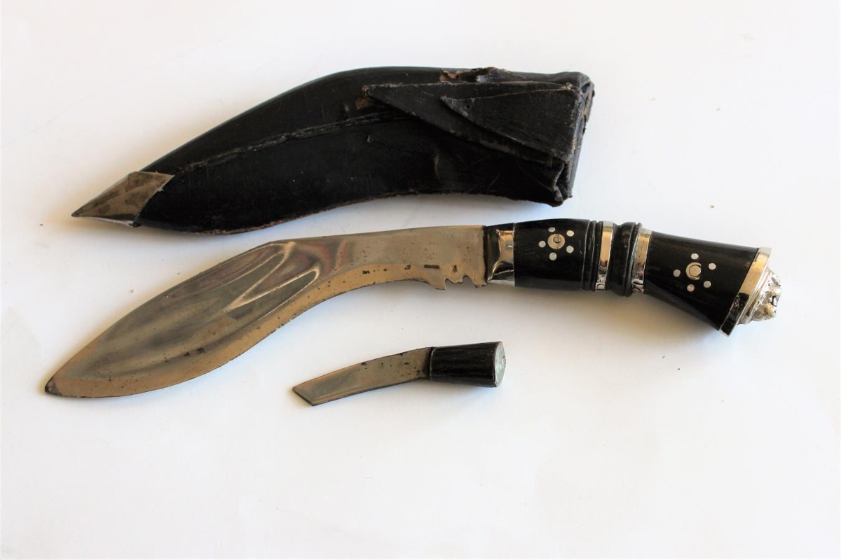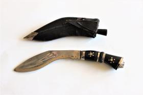 Indverskur skrauthnífur, bogalaga. Skaft innlagt málmdoppum og blað með skreytingum. Á það er letrað: INDIA. Er í leðurskeiðum. Lengd um 24 cm. Smáhnífur, annar í skeiðum. Hafa verið tveir. Úr dánarbúi Sveins Pálssonar frá Skammadal.
