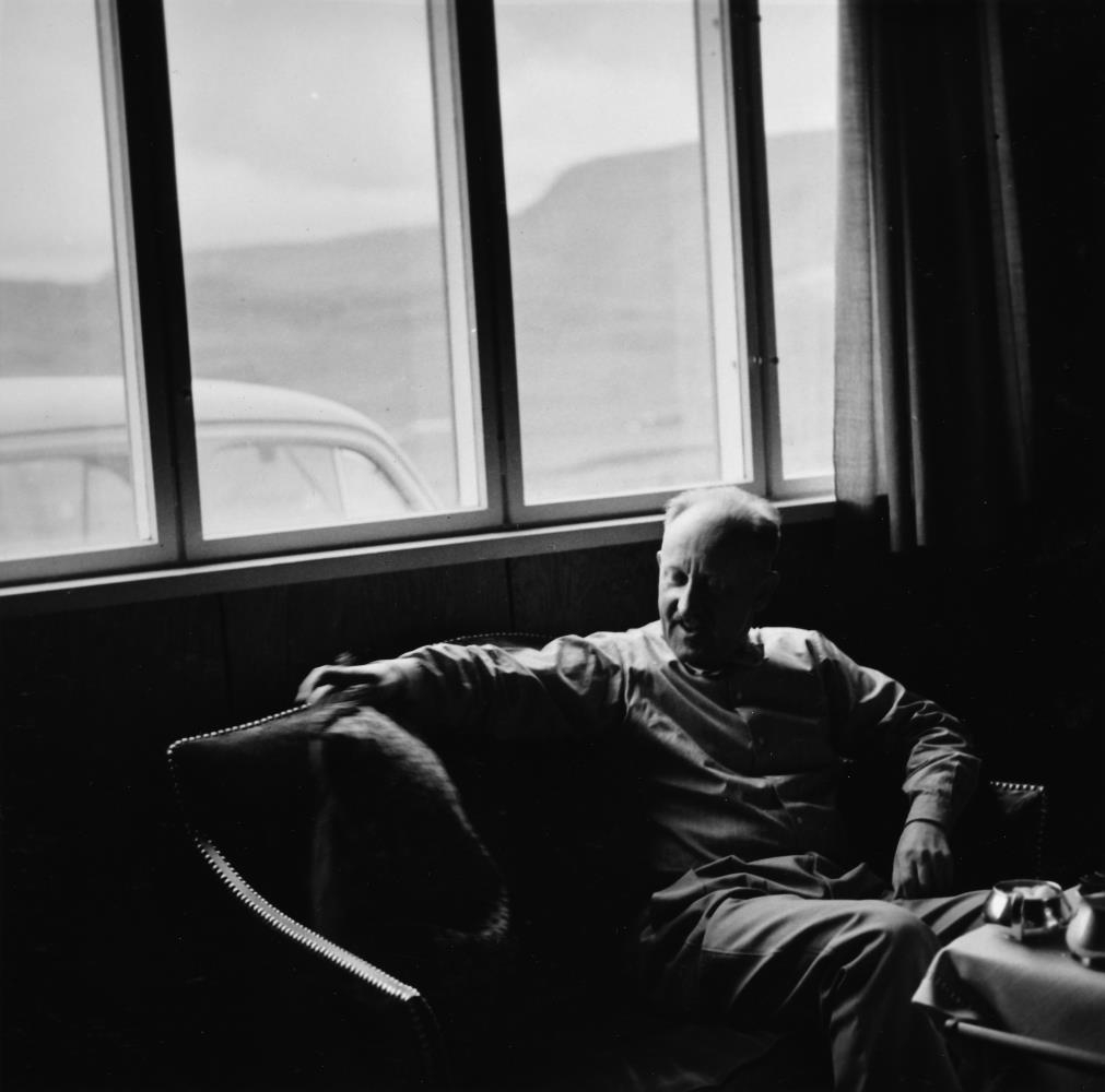 Halldór Laxness sumarið 1950 í stofunni á Gljúfrasteini.