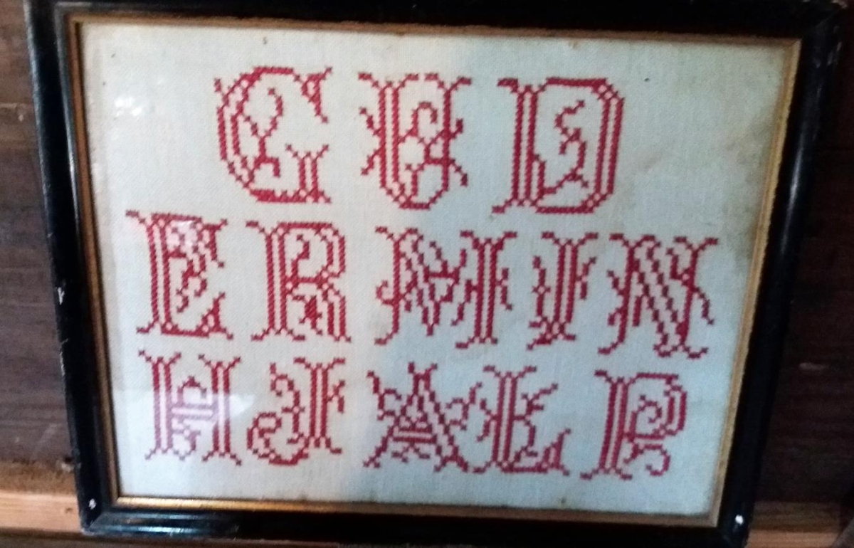 Orðin: "Guð er mín hjálp "saumuð rauðum upphafsstöfum í "stramma", í umgerð undir gleri.