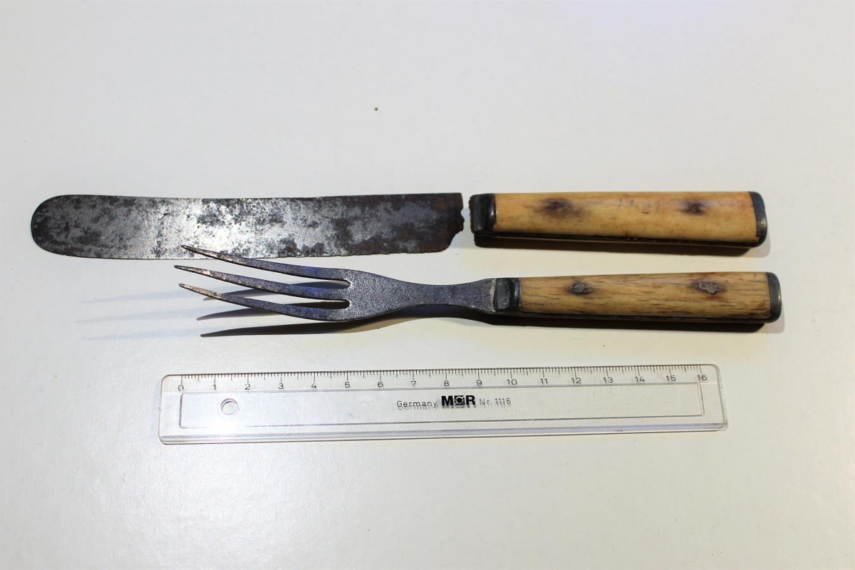 Hnífur og gaffall, hvorttveggja beinskeft. Úr brúðkaupsgjöf Skúla Thorarensen læknis á Móeiðarhvoli og konu hans, til Kristjáns Jónssonar og Ólafar Sigurðardóttur frá Barkarstöðum er lengi bjuggu í Marteinstungu. Hnífur brotinn við skaftið.