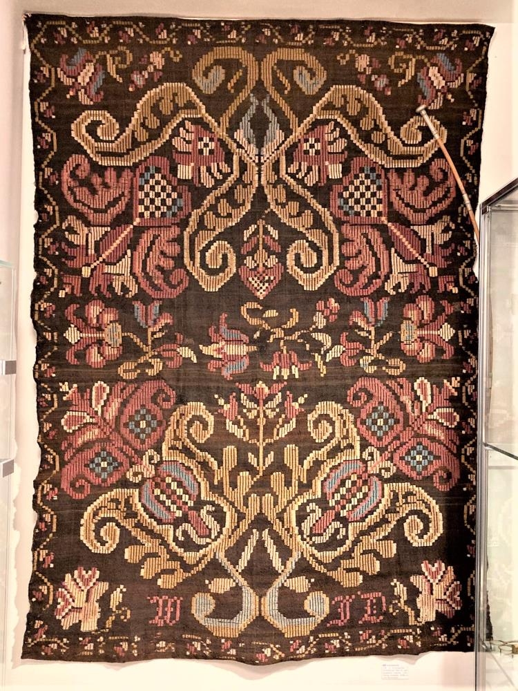 Söðuláklæði, glitofið. Í öðrum enda er fangamark:WJD = Vilborg Jónsdóttir, í hinum kynni að vera hluti af ártali - 66 = 1866. Áklæðið var í eigu Vilborgar Jónsdóttur í Berjanesi o.v. undir Eyjafjöllum og er unnið á æskuheimili hennar á Eyvindarmúla í Fljótshlíð. Dóttir Vilborgar, Sigríður Jónsdóttir var móðir gefanda.