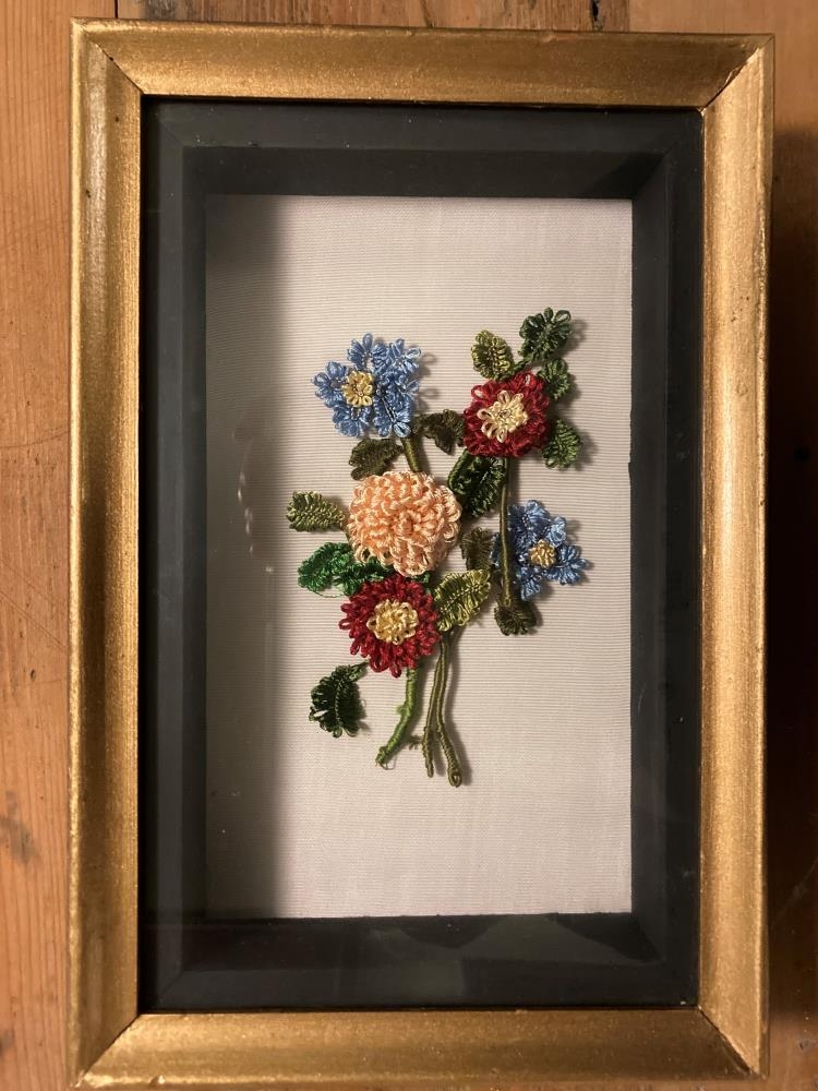 Innrömmuð blómamynd, verk blindrar konu, Margrétar Andrésdóttur, mágkonu gefanda, Hafliðínu. Stærð 25 x 17 cm. Skreyting vafin upp á vír. Safnið á tvö önnur myndverk sömu konu. Kom úr dánarbúi Hafliðínu Guðrúnar Hafliðadóttur frá Fossi á Ragnárvöllum , dáin 17.júlí 1984.
