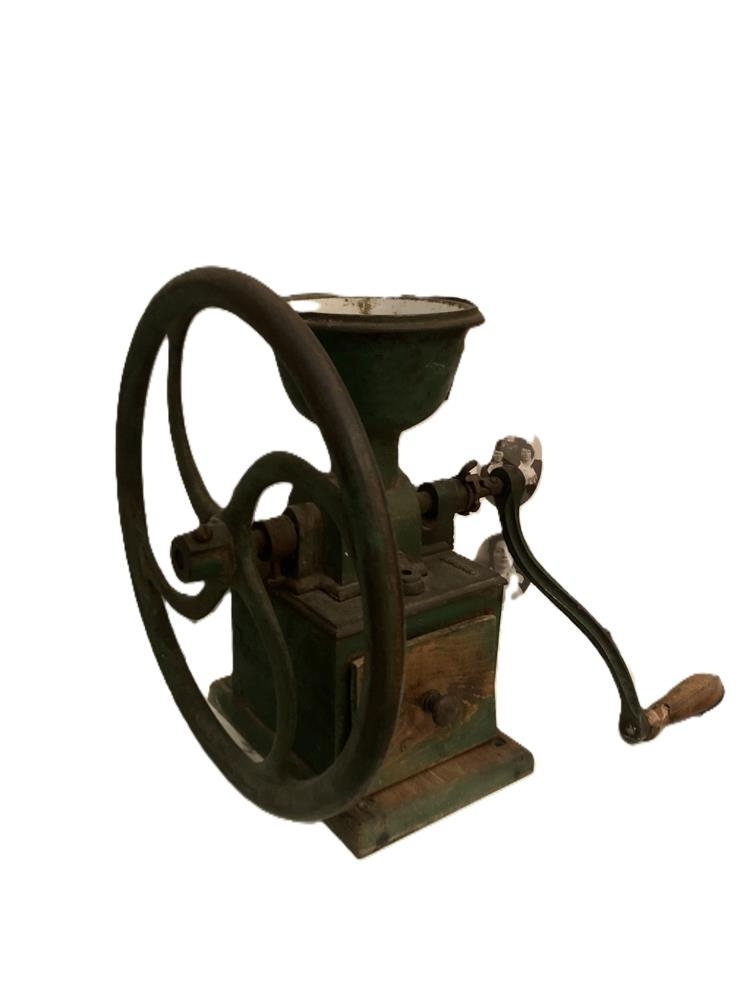 Kaffikvörn, útlend, handsnúin, óvenju stór af heimiliskaffikvörn að vera. Gefið af systrunum Matthildi og Ólöfu Ólafsdætrum frá Suður-Vík, hlutir úr búi Halldórs Jónssonar kaupmanns í Vík og sona hans Jóns og Ólafs.