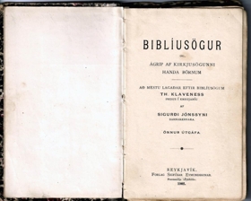Biblíusögur og ágrip af kirkjusögunni handa börnum / að mestu lagaðar eftir biblíusögum Th. Klaveness af Sigurði Jónssyni.