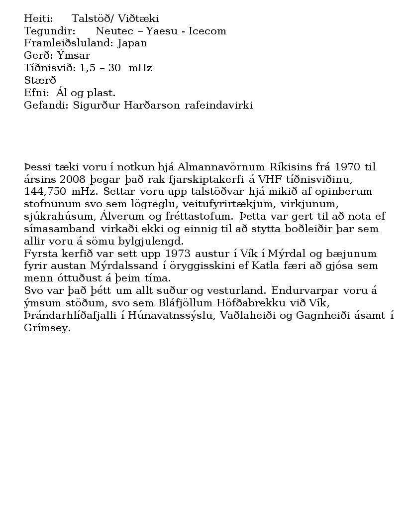 Talstöð/ Viðtæki, Neutec – Yaesu - Icecom. Framleiðsluland: Japan, gerð: Ýmsar, tíðnisvið: 1,5 – 30 mHz.