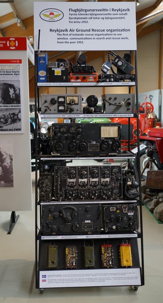 Á þessum sýningastandi eru fyrstu fjarskiptatæki Flugbjörgunarsveitarinnar í Reykjavík, frá stofnun hennar í nóvember 1950. Ekki leið langur tími þar til FBS eignaðist öflugan fjallabíl. Starfsmenn Radioverkstæðis Flugmálastjórnar innréttuðu fjarskiptaklefa í bílinn með mjög vönduðum talstöðvabúnaði þess tíma. Þar með var FBS fyrsta björgunarsveitin sem átti bíl með talstöð. Engin önnur björgunarsveit á landinu átti talstöðvar fyrr en nokkrum árum síðar. Þessar fyrstu talstöðvar FBS í fjallabílnum frá því 1954 eru úr flugvél. ART-13 sendirinn er með tíðnisvið frá 1,8 – 18 mHz, viðtækin ART-15 og Colings BC. Samanlögð þyngd sendis og tveggja viðtækja er um 100 kg. FBS átti fimm handstöðvar sem varnarliðið á Keflavíkurflugvelli skaffaði eftir sameiginlega æfingu árið1954. Þarna eru einnig Íslenska stöðin FF-3 bílstöð frá Landsímanum sem er frá 1960 með tíðnunum 2182, 2790 og 2912 kHz. Handstöð á Air bandinu ásamt aflmeiri fastastöð úr bíl. Miðunarstöð fyrir neyðarsenda. Einnig ferða VHF stöð á spennugjafa fyrir 160 mHz, VHF tíðnisvið björgunarsveitanna.