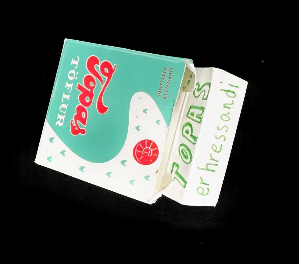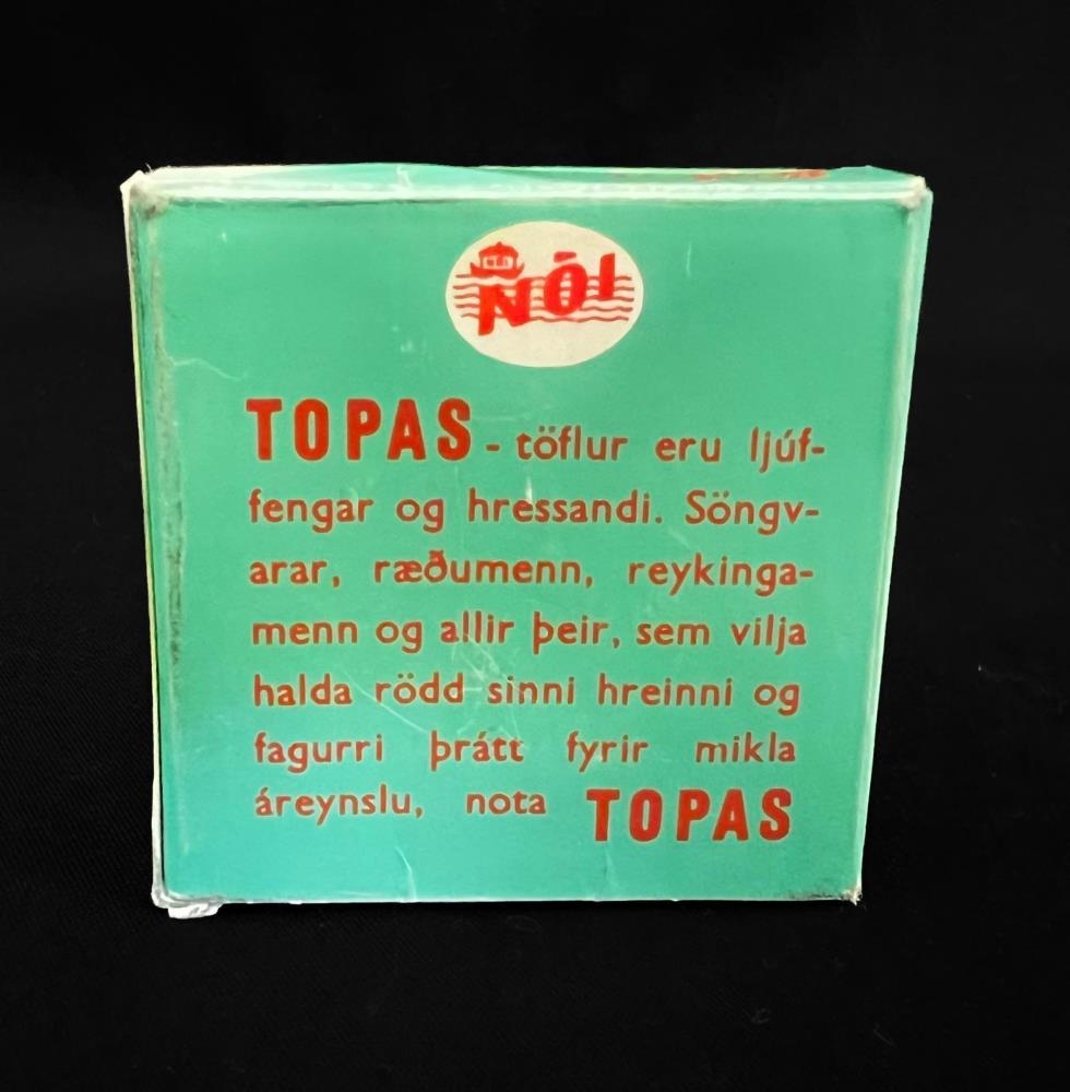 Grænn Tópas pakki. Gefandi hefur skrifað og skreytt pakkann að innan með Tópas slagorðum. Á pakkanum stendur : Ljúffengar. Hressandi. Tópas töflur. Brjóstsykursgerðin Nói. Topas - töflur eru ljúffengar og hressandi. Söngvarar, ræðumenn, reykingamenn og allir þeir sem vilja halda rödd sinni hreinni og fagurri þrátt fyrir mikla áreynslu, nota Topas.
