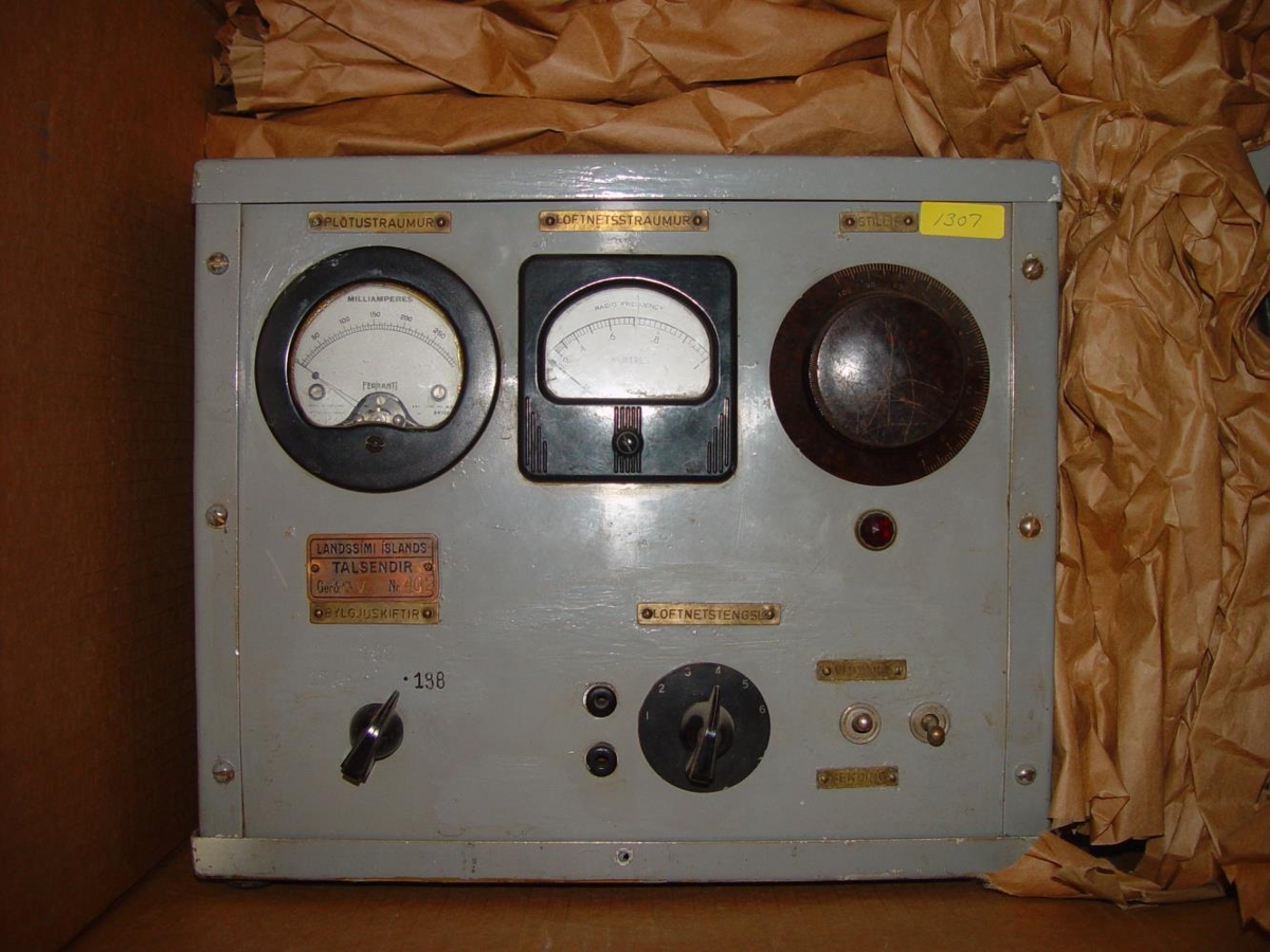 Talstöð, tegund: GV Nr 198, gerð: 10 Watta AM talstöð, framleiðandi: Landsíminn, tíðnisvið: 2 – 3 mHz Bátabylgja. Stærð: B 31 - H 27 – D 22 sm. Efni: álundirstaða ásamt kassa og grárri framhlið. Gefandi: Sigurður Harðarson rafeindavirki.
