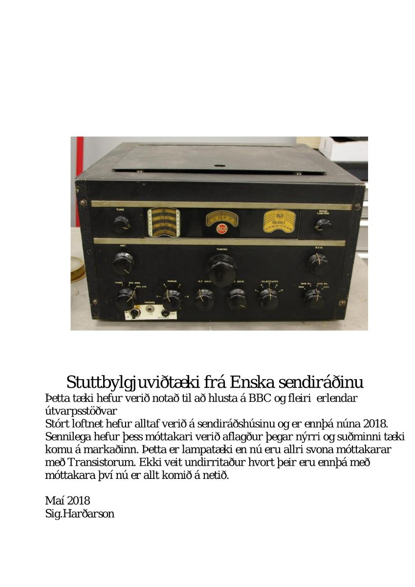 Tækinu var bjargað úr geymslu Landsímans sem rýmd var árið 2005. Þetta tæki hefur verið notað til að hlusta á BBC og fleiri erlendar útvarpsstöðvar. Stórt loftnet hefur alltaf verið á sendiráðshúsinu og er ennþá núna 2018. Sennilega hefur þess móttakari verið aflagður þegar nýrri og suðminni tæki komu á markaðinn. Þetta er lampatæki en nú eru allri svona móttakarar með Transistorum. Hægt hefur verið að hlusta á öll fjarskipti milli skipa í þorskastríðinu, því þessi fjarskipti voru öllum opin.