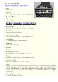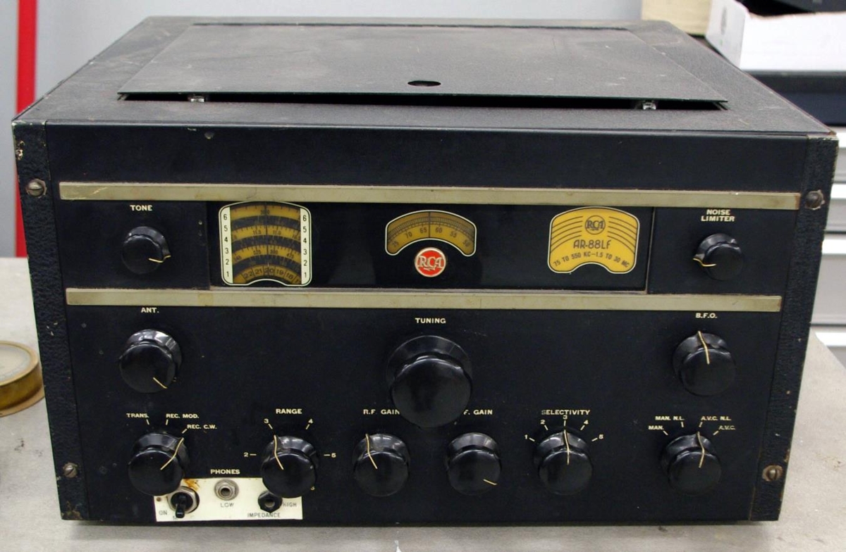 Viðtæki, tegund: RCA, gerð: AR-88.LF. Framleiðsluland: USA. Tíðnisvið: 1,5 – 30 mHz. Bátabylgja. Viðtækið einnig með Langbylgju. Efni: Ál undirstaða ásamt kassa með svörtum lokum og framhlið.