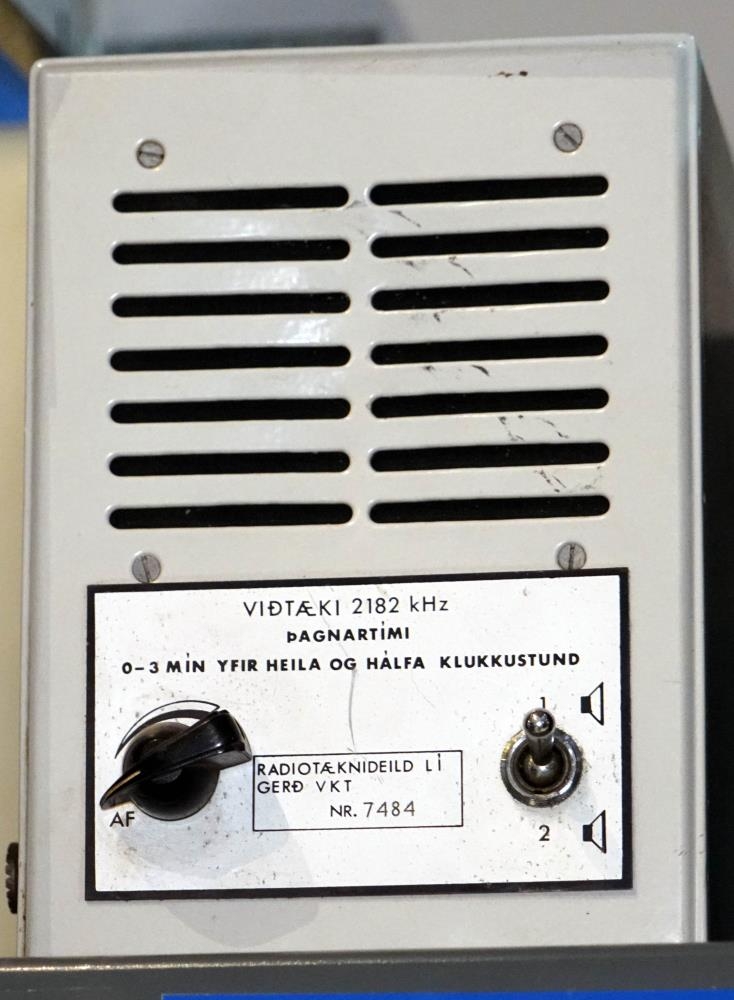 Hlusttæki fyrir neyðartíðni 2182 kHz. með hátalara. Fyrir neðan hann er límd málmplata, þar stendur VIÐTÆKI 2182 kHz, Þagnartími 0-3 MÍN YFIR HEILA OG HÁLFA KLUKKUSTUND. í ramma teiknaður á plötunna stendur: RADIOTÆKNIDEILD L í , GERÐ VKT NR. 7480. Framan á tækinu yfir plötunni vinstra megin er styrkstillir með rofa. Hægra megin er rofi, þar er sýnt að hægt er að stilla á hátalara 1 eða 2 sem var þá aukahátalari á öðrum stað. Á vinstri hlið tækisins er inntak fyrir loftnet og tengi fyrir spennu.