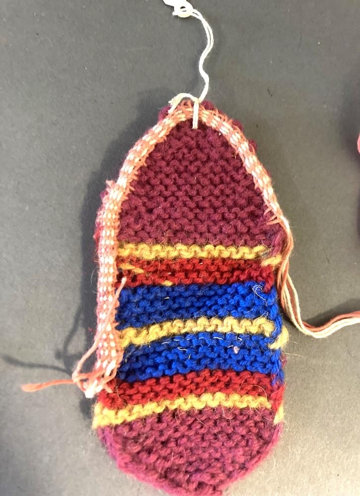 Barði, barnsbarði, þverröndóttur, prjónaður með garðaprjóni, slingdur á jöðrum að nokkru leyti og fylgir slangan með hafaldinu. Þetta er verk Geirlaugar Filippusdóttur sem kallar það "að slengja". Aðeins gert til að sýna verklagið.