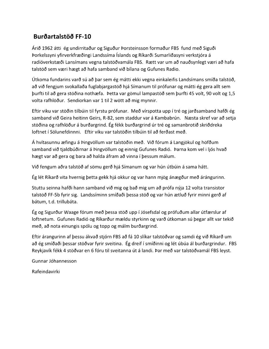Burðartalstöðin FF-10 er íslensk hönnun frá árunum 1962-63. Upphaflega smíðuð sem neyðartalstöð fyrir slysavarnaskýli á afskekktum stöðum en endurhönnuð fyrir björgunarsveitir með tíðnunum 2790 og 2912 kHz. Stöðin er alfarið með Transistora bæði í sendi og viðtæki. Stöðin er framhald af FF-5 bílstöðinni sem er svipuð en með sendilampa en þessar FF-10 eru alfarið með Transistorum. Sendistyrkur hennar er 10 wött. 12 volta rafgeymir var við stöðina.