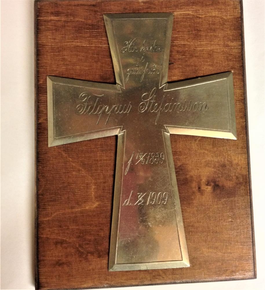 Nýsilfurkross festur á tréspjald. Á hann er letrað:" Hér hvílir í guðs friði Filippus Stefánsson, f.17/9 1839, d. 7/2 1909". Þetta er verk Erlings Filippussonar grasalæknis, sonar Filippusar silfursmiðs og móðurbróður gefanda. Gefið af frú Þórunni Jónsdóttur í Reykjavík.