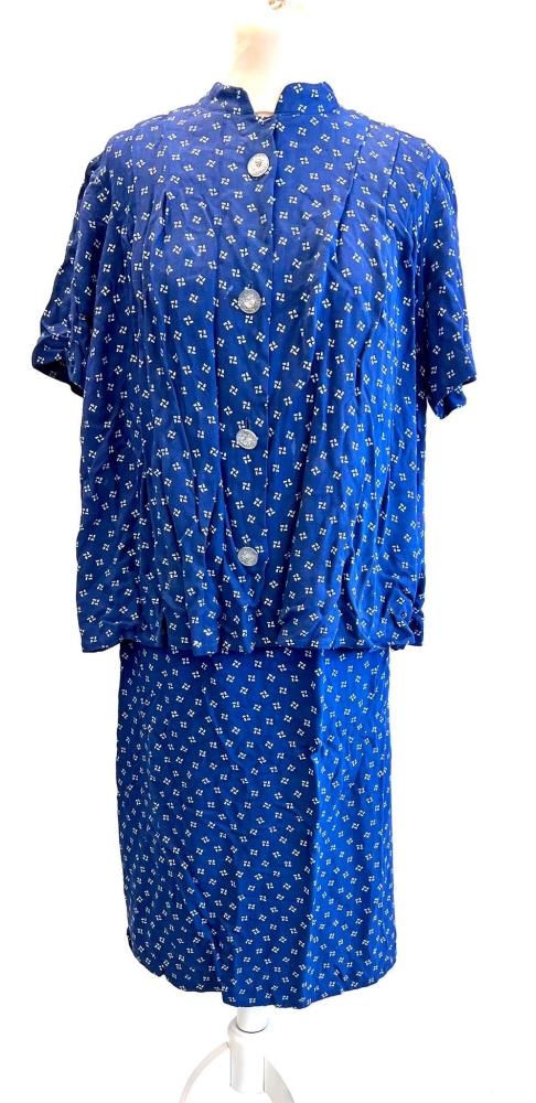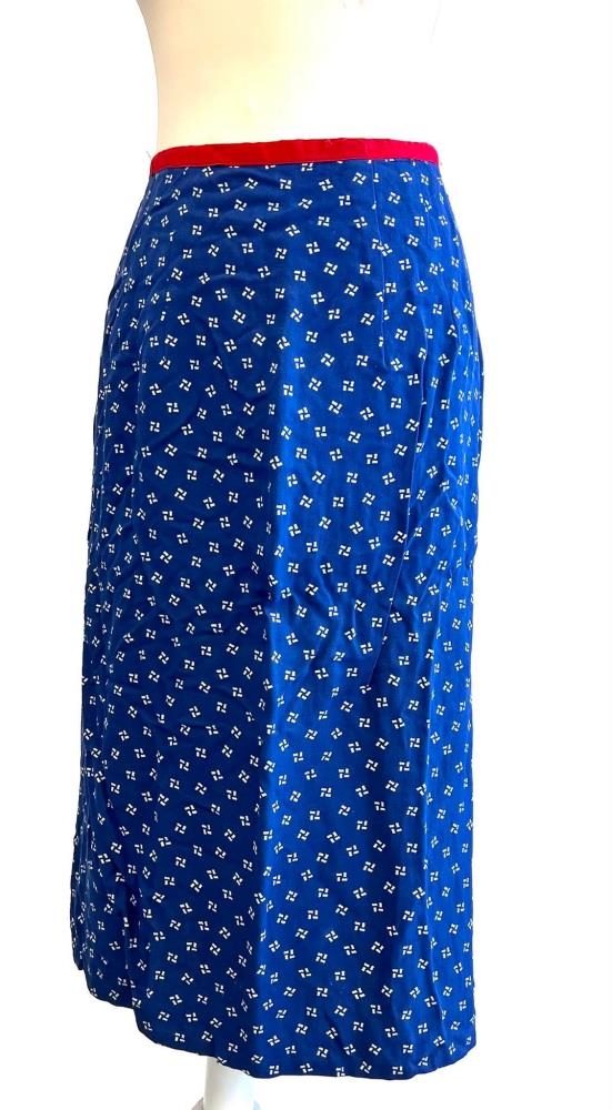 Blá pilsdragt með smágerðu munstri, hvítum ferköntuðum fleygum. Á pilsi er rautt efni í mittið.