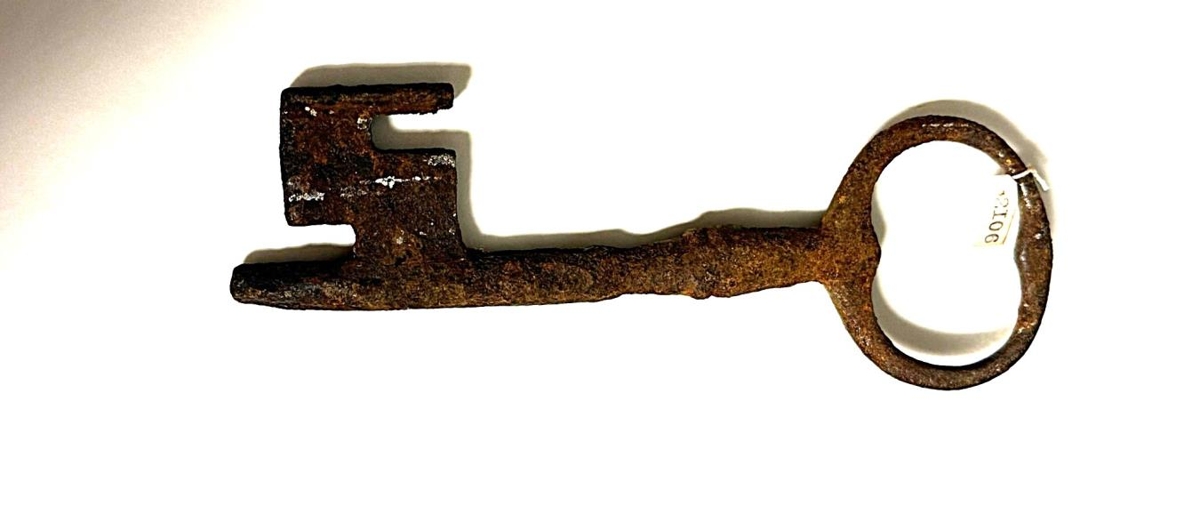 Járnlykill, ryðeyddur, lengd 13 cm. breidd höldu 4,5 cm., breidd skeggs 3,5 cm.