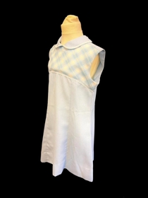 Ljósblár skokkur, köflóttur efri hluti. Sama ljósbláa efnið í stuttum jakka við skokkinn. Gulir kúlulaga hnappar.