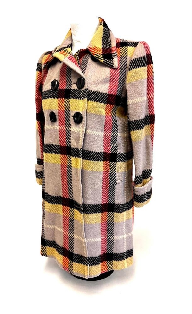 Köflótt kápa, brúnleit í grunninn en með rauðu og gulu munstri. Tvíhneppt.