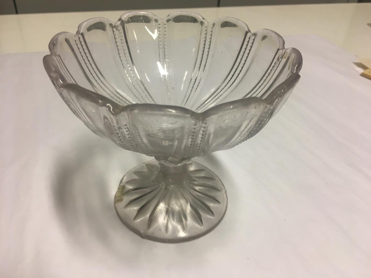 Sykurkar á fæti, úr gleri. Úr búi Þorsteins Jónssonar og Guðrúnar Jónsdóttur í Drangshlíð, afa og ömmu gefanda.