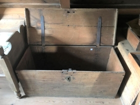 ómáluð (búrkista), lengd. 1,12 m., breidd 45 sm., hæð. 47 sm. Kistan er