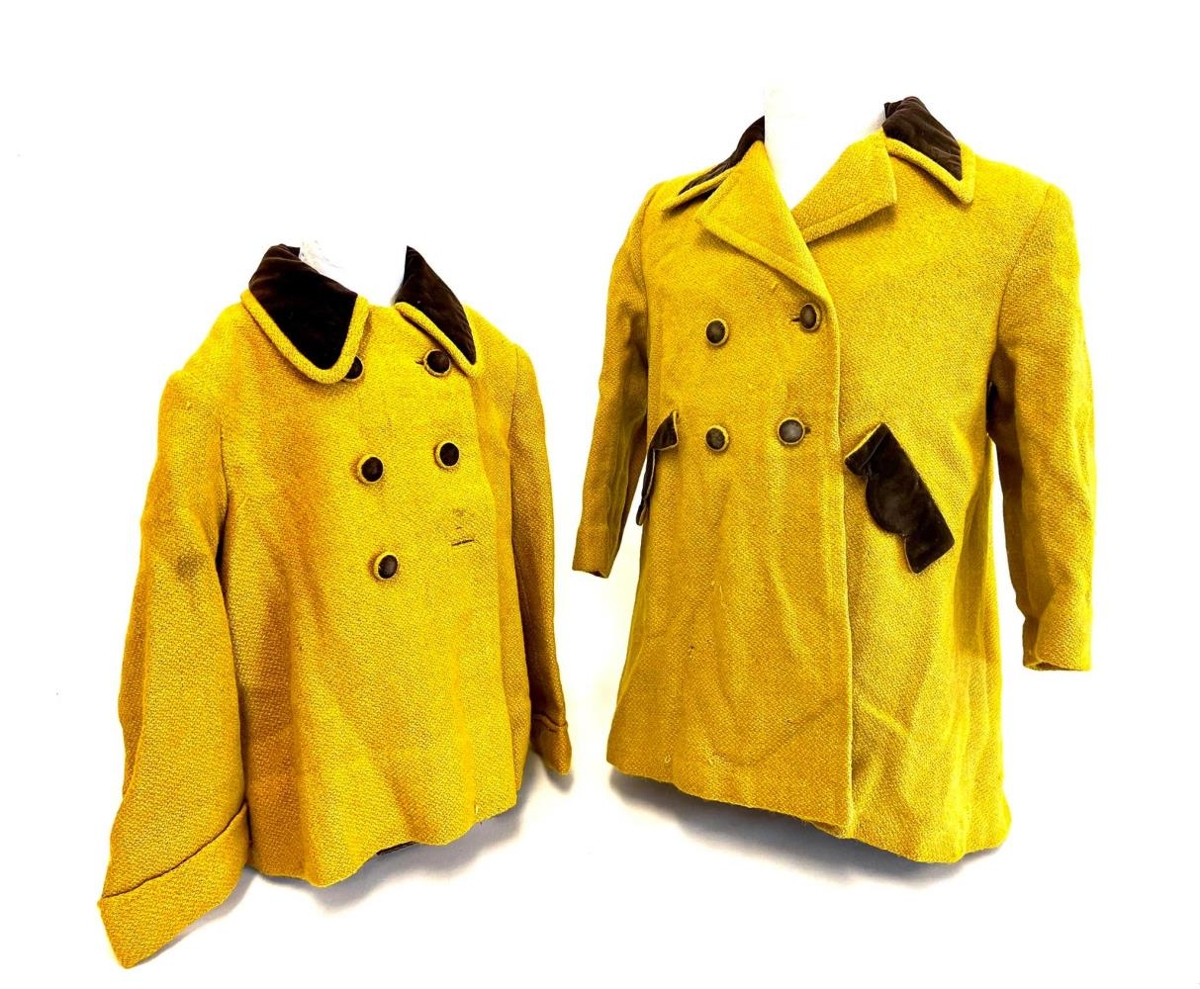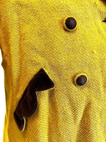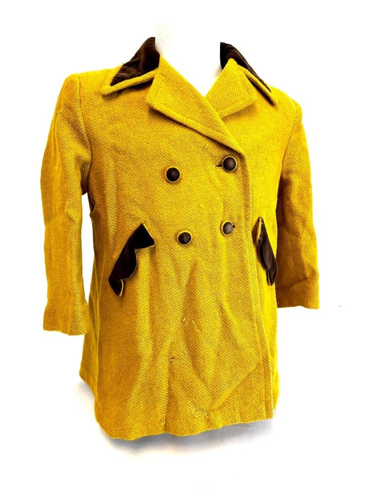 Barnakápa úr gulu ullarefni. Brúnt efni yfir vösum og sami litur á yfirdekktum hnöppum.