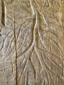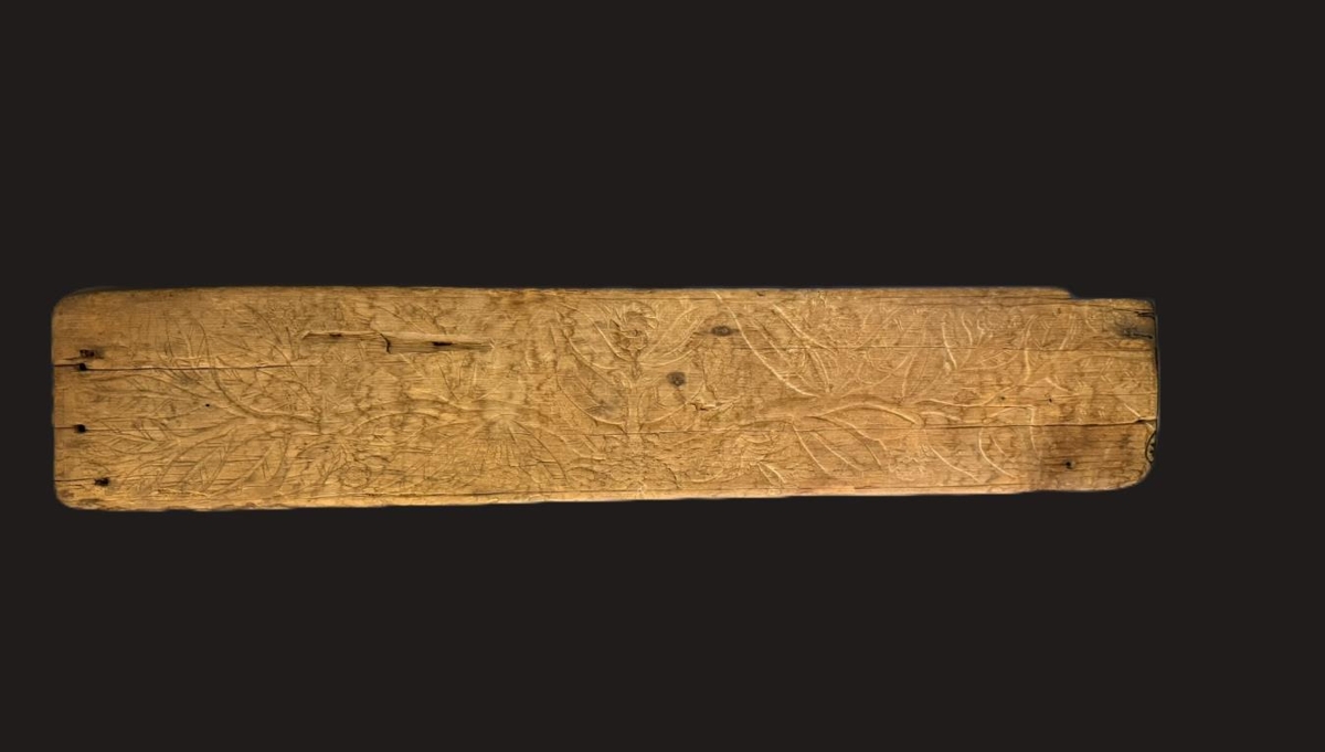 Rúmfjöl, útskorin, óvíst af hverjum. Afhent af Ísak Eiríkssyni.