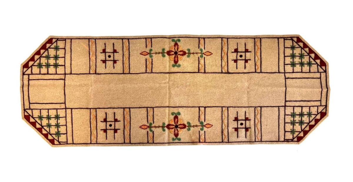 Ljós aflangur dúkur með brúnum útsaum og smáum blómamyndum. Guðrún Kristjánsdóttir gerði og gaf Hólmfríði Magnúsdóttur.