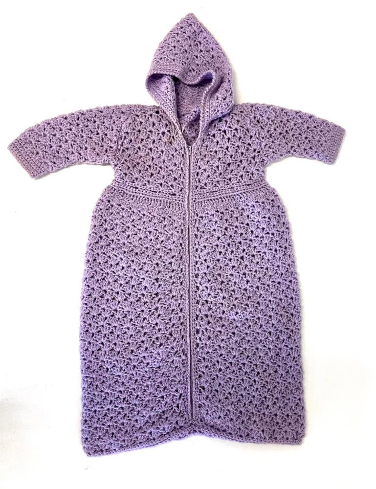 Heklaður fjólublár kerrupoki með ermum og hettu. Gígja gerði árið 1972