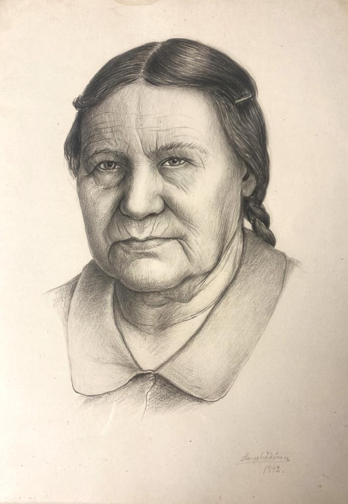 Innrömmuð teikning, svart-hvít (blýantsteikning) af Rannveigu Einarsdóttur frá Strönd í Meðallandi (f. 1867). Gerð af Skarphéðni Haraldssyni frá Kerlingardal árið 1942. Gefendur Brynjólfur Már Sveinsson í Reykjavík og systir hans Svanhvít Sveinsdóttir í Vík í Mýrdal: